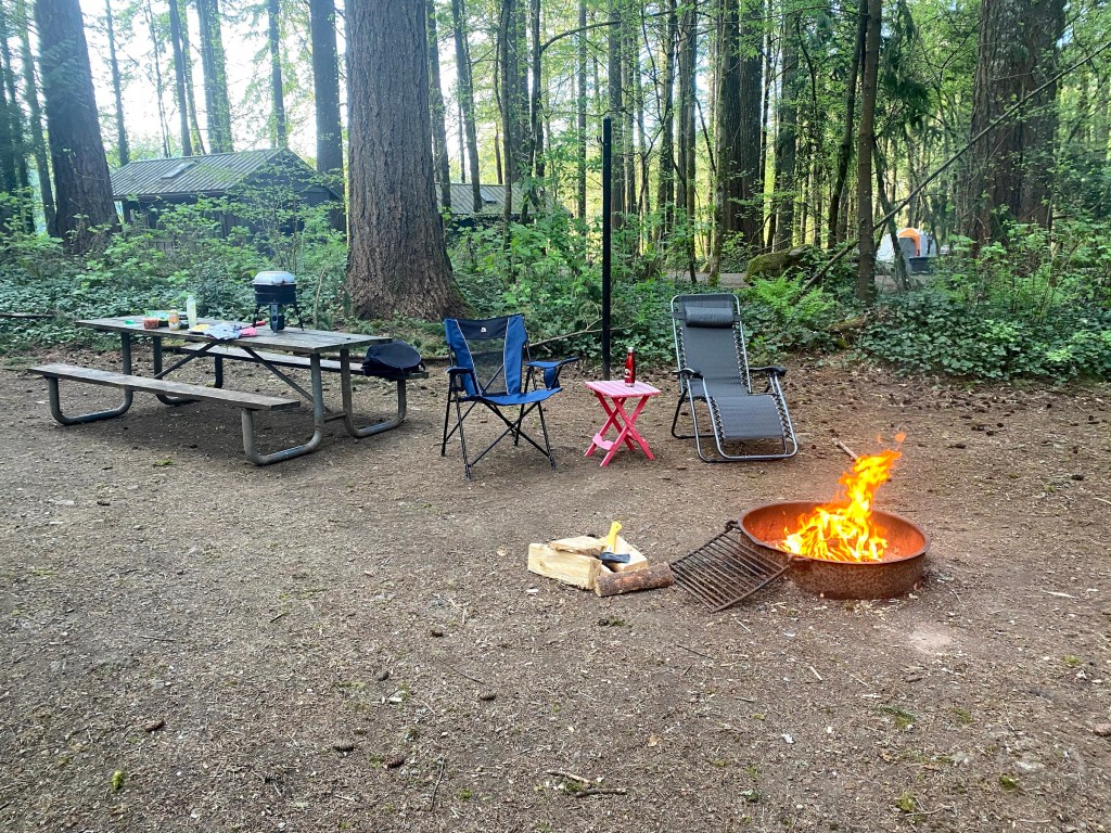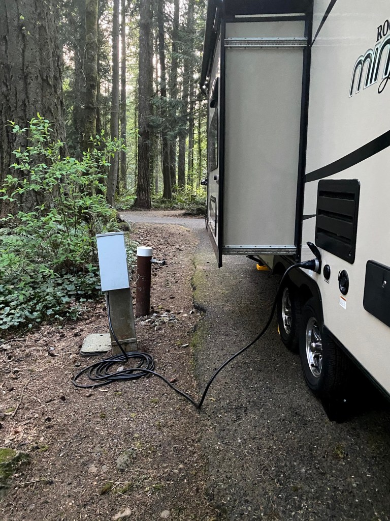 4-21-21: Today I had a reservation to camp at Battle Ground Lake State park. As I arrived I slowly cruised in to find my spot and size up how to get the trailer parked, knowing it was a “back in” site. (RVers will relate, the dreaded backing up, its something I start thinking stressing? about as I get close to camp.) I’m sure as I get used to towing it will go away.