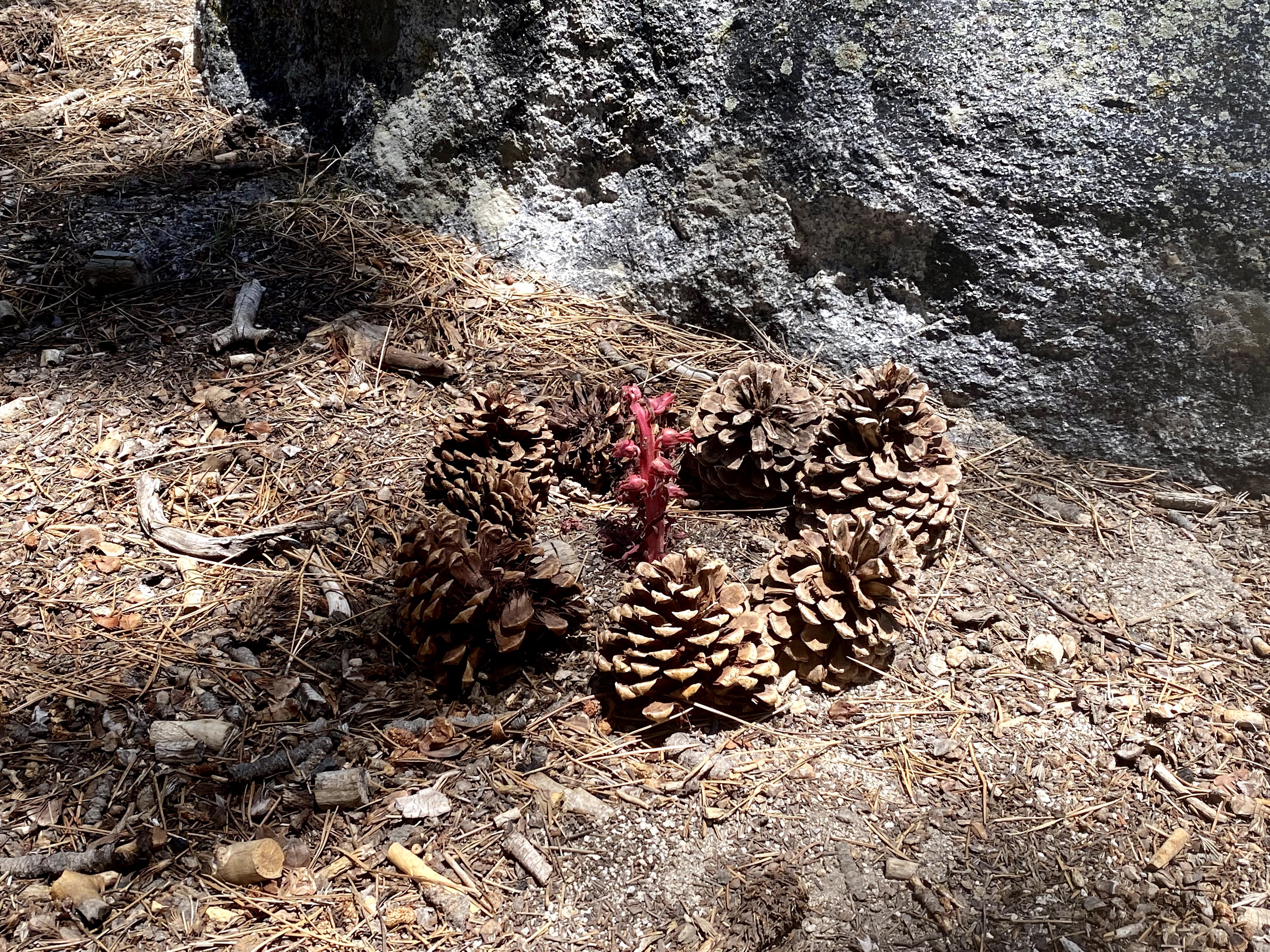 I have to say it was a great spot, it was cool, peaceful and I had it all to myself. There was a great rock formation that has a natural stair case leading to a flat rock that is just perfect to sit on and ponder the view. I also saw my first Snow Flower. (The little red flower pictured below that someone had protected with a pine cone fence.)