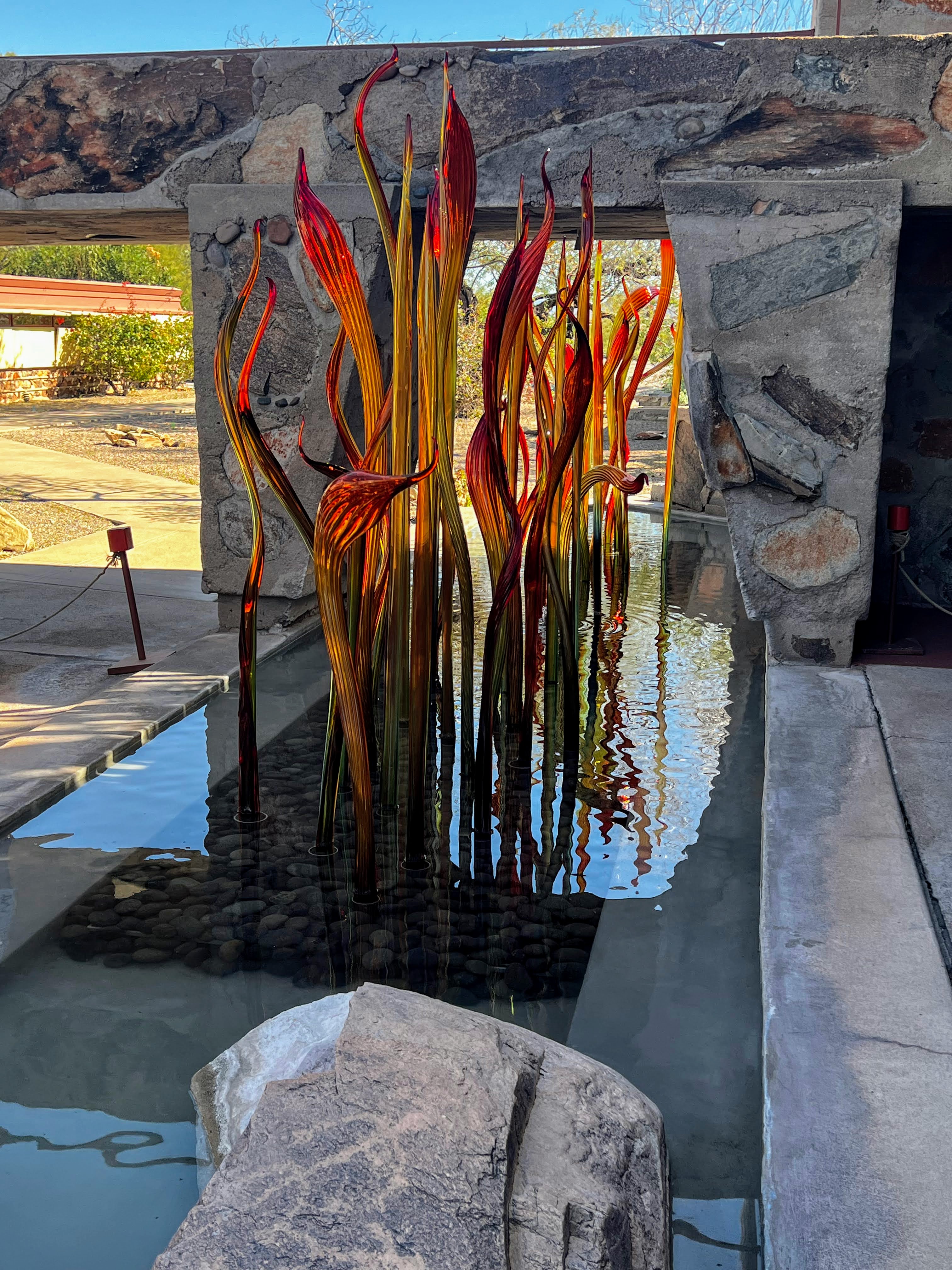 I wanted to visit the area since I have an old friend living in Mesa, AZ but also so that I could visit Taliesin West, Frank Lloyd Wright’s laboratory in the desert west. I guess those Wisconsin winters got to be a bit much in his later years. I have been fascinated by his experiment here and while the house and buildings are very much in his style, everything was actually built by FLW and his interns at the school. There is only one remaining fellow still residing at the school from this time. During the tour we were told that they intend to launch a new school of architecture after a long hiatus.