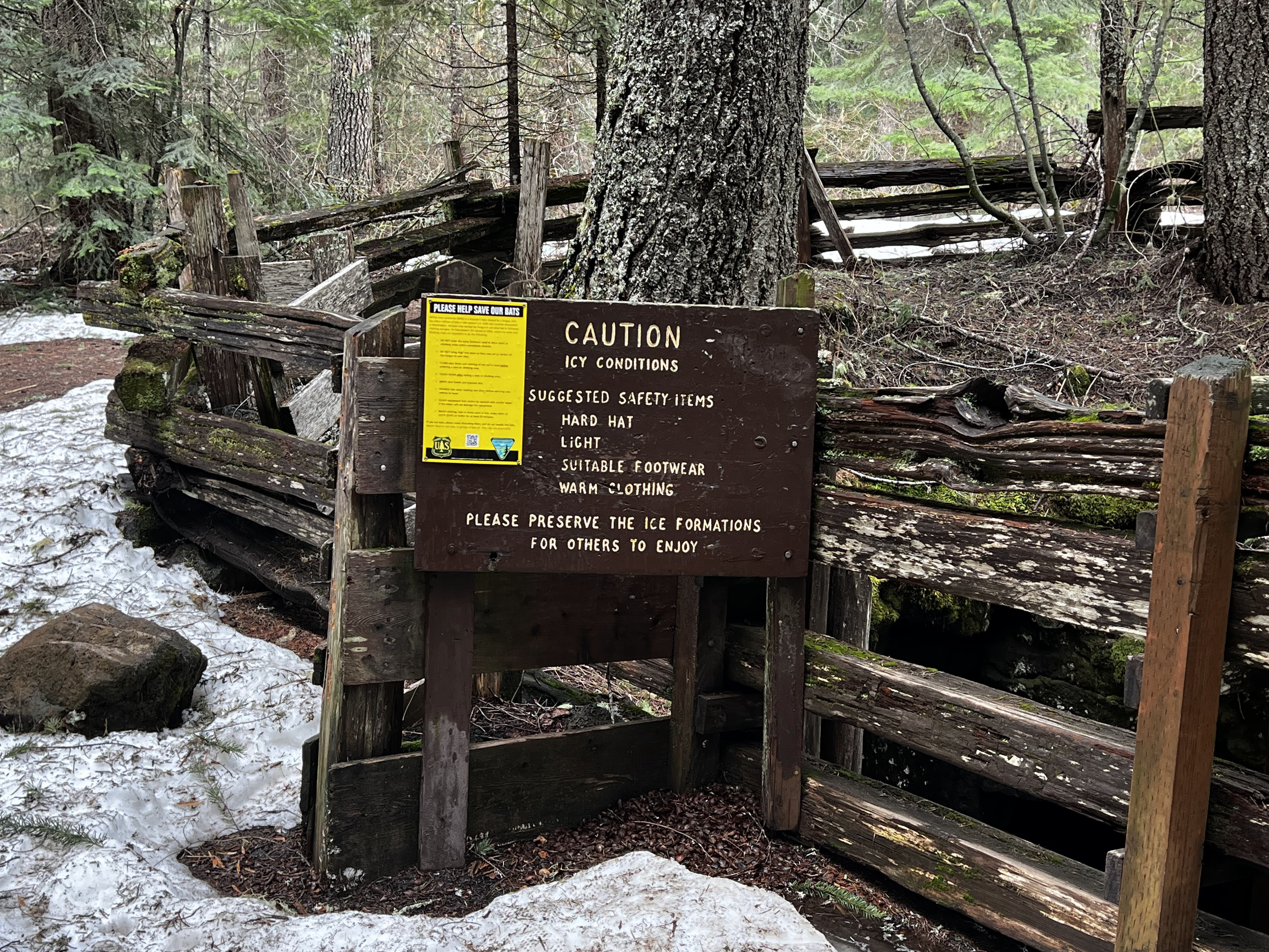 It’s only a very short walk to the entrance of the cave. Once you go down the stairway you can see a few feet into the cave, on my visit the stairs were still partially buried in snow and I had to carefully scramble over the last few feet onto the very slippery snow/ice covered rocks. I can see why they recommend a hard hat for your visit! If you have ever tried to walk on uneven wet ice you know this is not easy, in fact I was only able to make it about 10 feet from the stairs until I came to my senses and realized that I would need microspikes for my hiking boots if I intended to proceed. Also, some walking poles would help too.