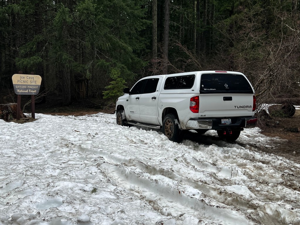 Out on a motorcycle ride near Trout Lake I saw a sign for Guler Ice caves, it was still early in the season and only the paved road was clear of snow so I made a note to return on another day. The area is very scenic and I was happy to return in the truck to explore. I had done some research on visiting and came prepared with warm clothes a headlamp and back up flashlight as recommended by the USFS. I was able to get into the access road with no issues and wasn’t too surprised to find the parking lot was still covered with snow.