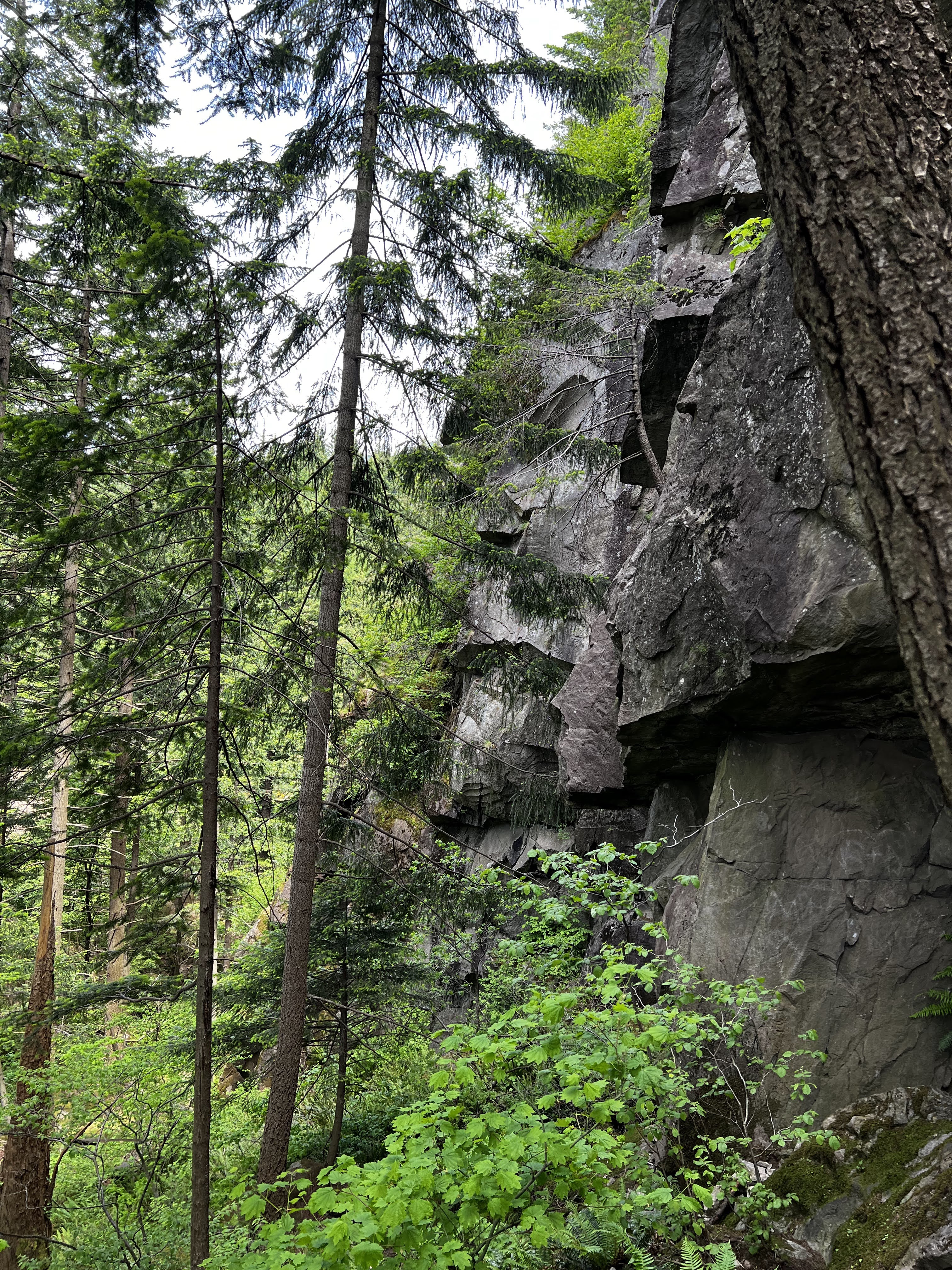 The views start as soon as you leave the parking area, you might be treated to climbers attempting to scale the northwest wall and from there you enter the treeline and the trail begins to climb towards the rock itself.